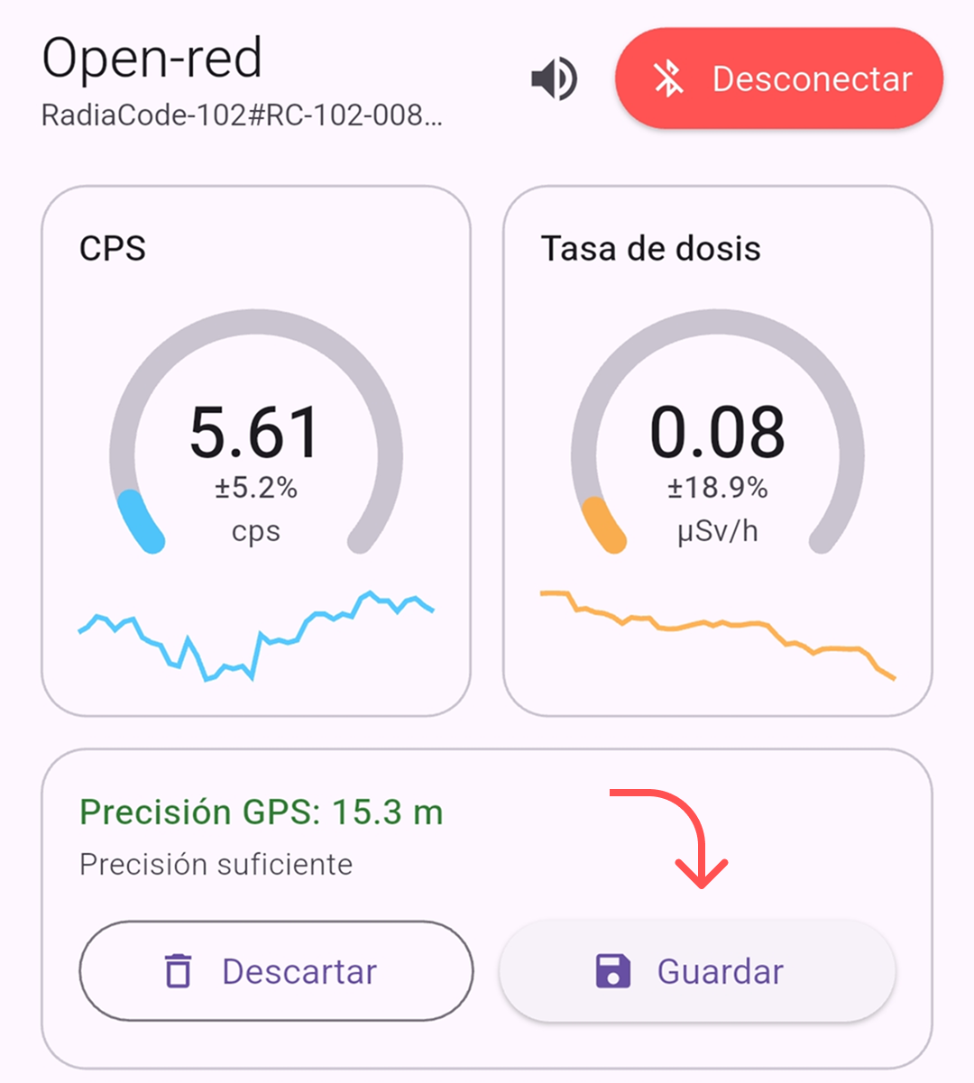2.4 Una vez enlazado, el RadiaCode aparecerá conectado en la parte superior de la App